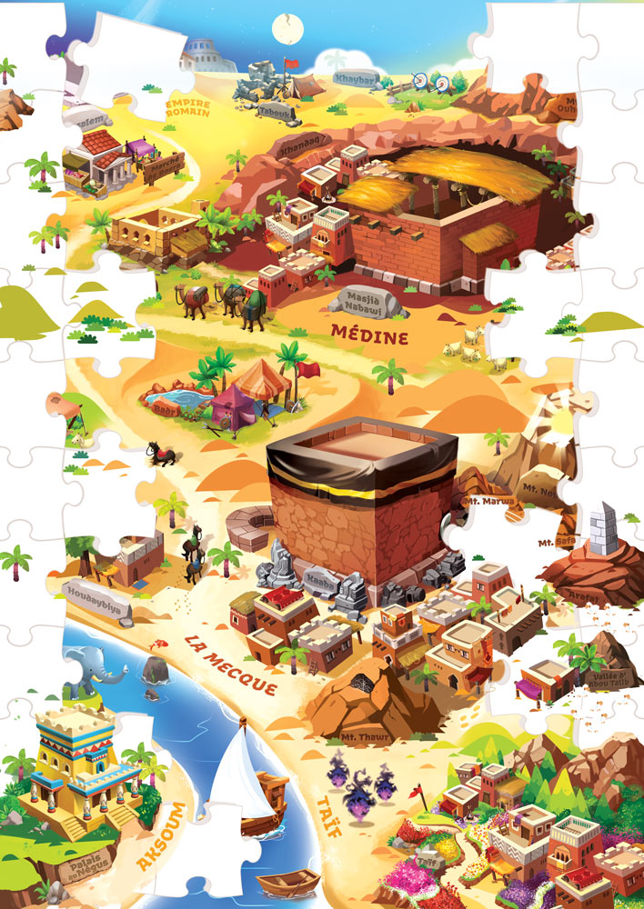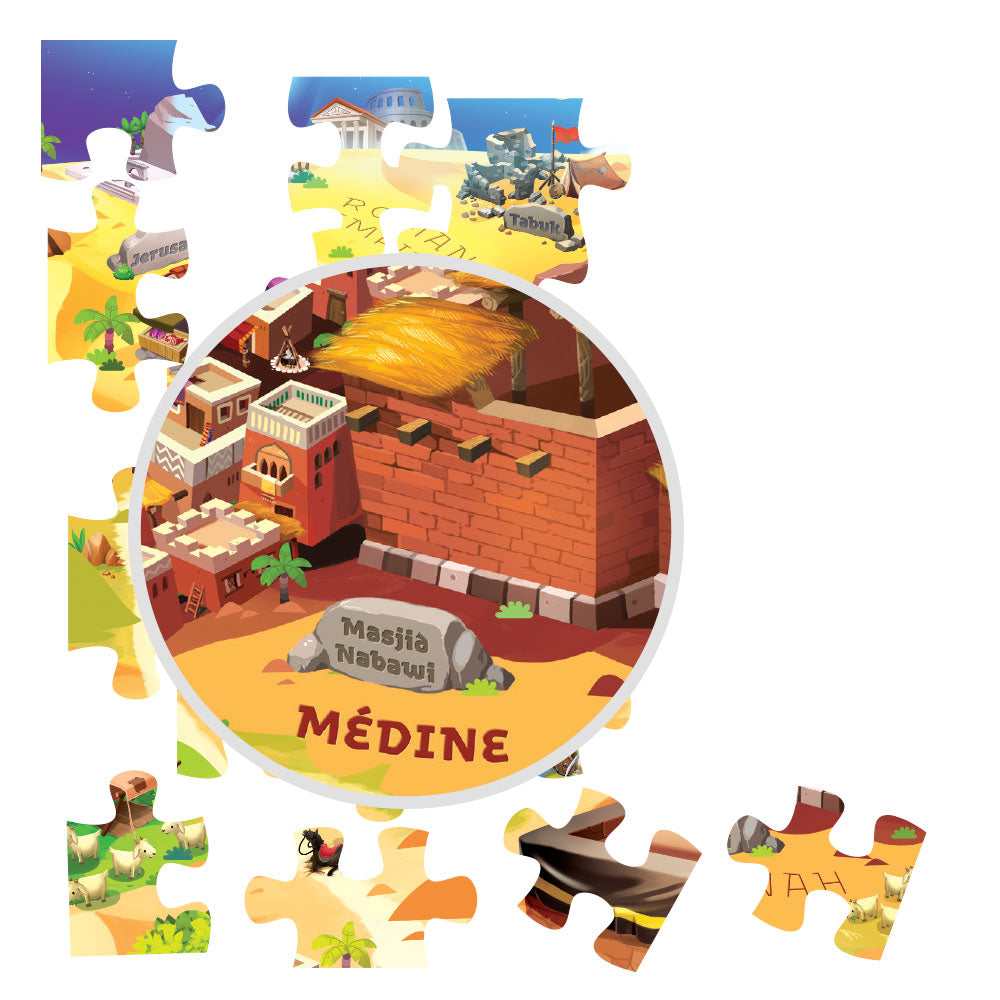 Composé d’un puzzle de 40 pièces et d’une fresque chronologique, il retrace les principales étapes de la vie du Prophète ﷺ en les reliant aux lieux marquants de son histoire. Une fois la carte reconstituée, votre enfant peut suivre la chronologie des événements en s’appuyant sur la grille de localisation pour mieux situer chaque étape.